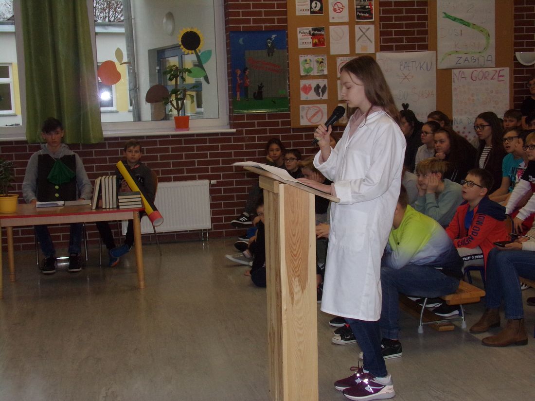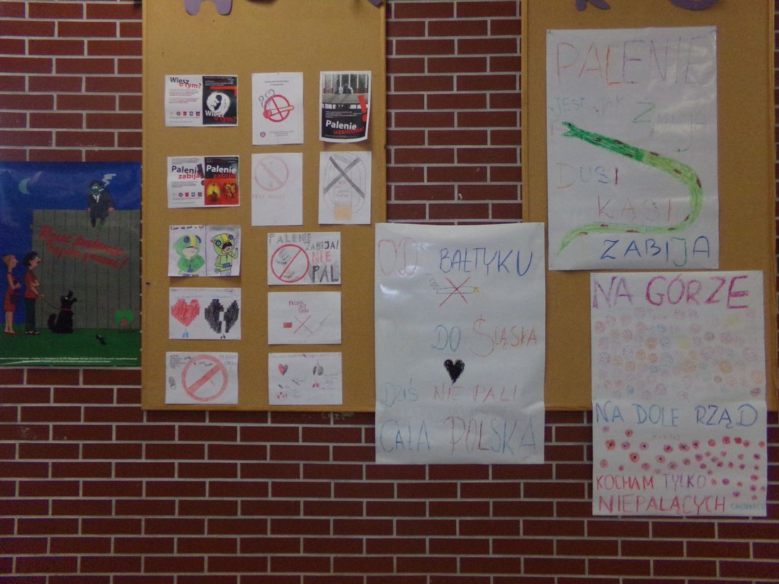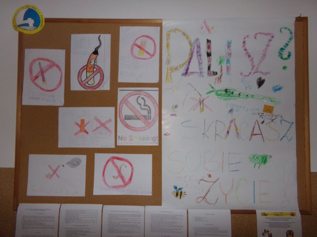 listopada na całym świecie obchodzony jest Światowy Dzień Rzucania Palenia. Święto to przypada zawsze na w trzeci czwartek listopada. Głównym celem obchodów jest zwiększenie świadomości o szkodliwości palenia papierosów i zerwanie z nałogiem palaczy. Pomysł akcji narodził się z inicjatywy dziennikarza Lynna Smitha, który w 1974 roku zaapelował do czytelników swojej gazety, aby przez jeden dzień nie palili papierosów. W efekcie, aż 150 tys. ludzi spróbowało przez jedną dobę wytrzymać bez palenia. W Polsce ten dzień obchodzony jest od 1991roku. Do powyższej akcji przyłączyli się uczniowie Szkoły Podstawowej nr 4 w Nowogardzie. Swoje opinie na temat szkodliwości palenia papierosów przedstawili na plakatach, które zostały rozwieszone w świetlicy szkolnej. W ramach akcji w klasach 5 i 6 odbyły się zajęcia warsztatowe przeprowadzone przez panią pielęgniarkę dotyczące szkodliwości palenia papierosów. Podsumowaniem działań był apel przygotowany przez uczniów klasy 7 i 8 pt. „ Sąd nad papierosem”.