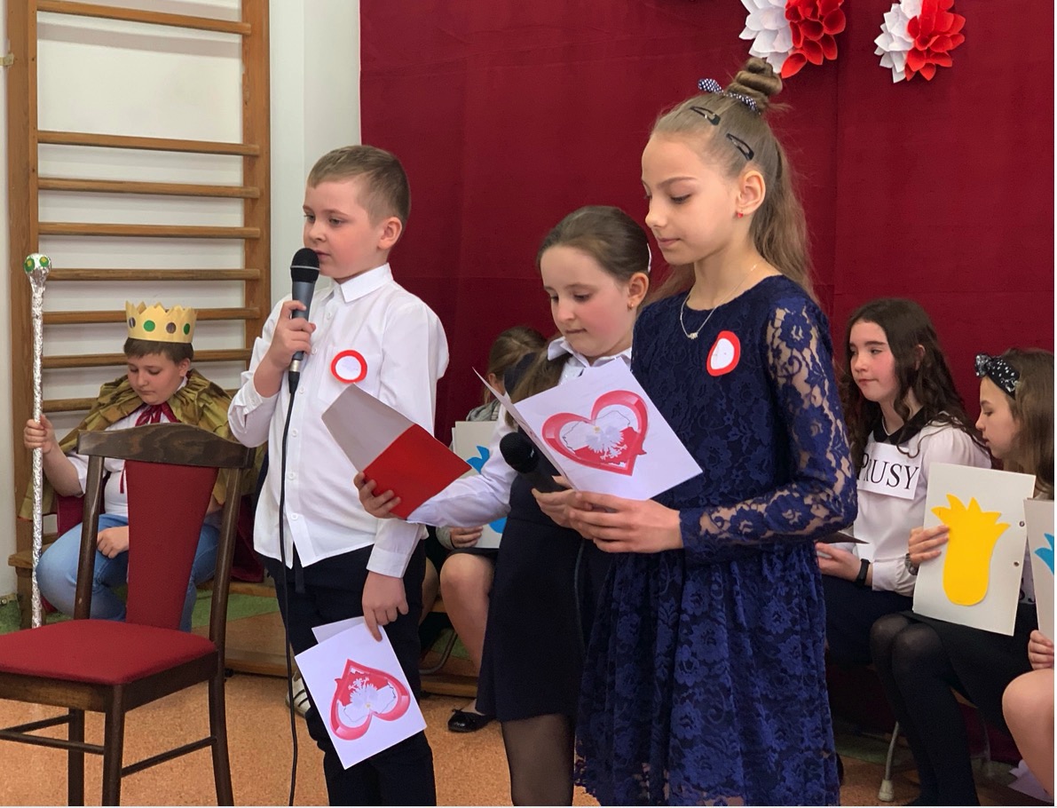 W piątek, 29 maja uczniowie naszej szkoły pod kierunkiem pani Katarzyny Szymańskiej i Pana Krzysztofa Haziaka przygotowali i przedstawili uroczystą akademię pod tytułem "Witaj Majowa Jutrzenko". Podczas uroczystości uczennice klasy czwartej zaprezentowały scenki obrazujące wydarzenia, które doprowadziły do pierwszego rozbioru Polski. Uczniowie klas 4-7 wcielili się w role posłów, senatorów, króla oraz gości z odległych Stanów Zjednoczonych, przedstawiając przekonujące sceny z obrad Sejmu Wielkiego, które doprowadziły do najważniejszej uchwały - uchwały zatwierdzającej utworzenie pierwszej w Europie i drugiej na świecie konstytucji - Konstytucji 3 Maja 1791 roku. Po przyjęciu uchwały król uroczyście zaprzysiągł najważniejszy dokument w państwie, po czym wezwał zebranych, aby wraz z nim udali się do kościoła i tam złożyli wspólną przysięgę Bogu. Tym ważnym wydarzeniom towarzyszyły pięknie wykonane pieśni patriotyczne i wiersze uczniów z klas od 3 do 7.Lektorkami podczas akademii były uczennice z klasy siódmej, które wspomniały również o Święcie Pracy przypadającym na 1 maja i Dniu Flagi oraz Polonii i Polaków za granicą, które przypadają na 2 maja.Splendoru i powagi całej uroczystości nadawała obecność pocztu sztandarowego reprezentowanego przez uczniów najstarszej klasy w szkole - klasy ósmej.