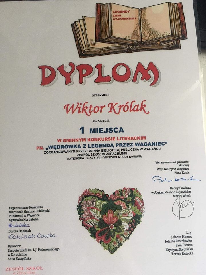 - W Gminnym Konkursie Literackim "Wędrówka z legendą przez Waganiec" Wiktor Królak z klasy VII zdobył I miejsce, a Wiktoria Kotrych III miejsce. Nagrodę Radnego Powiatu w Aleksandrowie Kuj. otrzymała Gabriela Nowakowska.