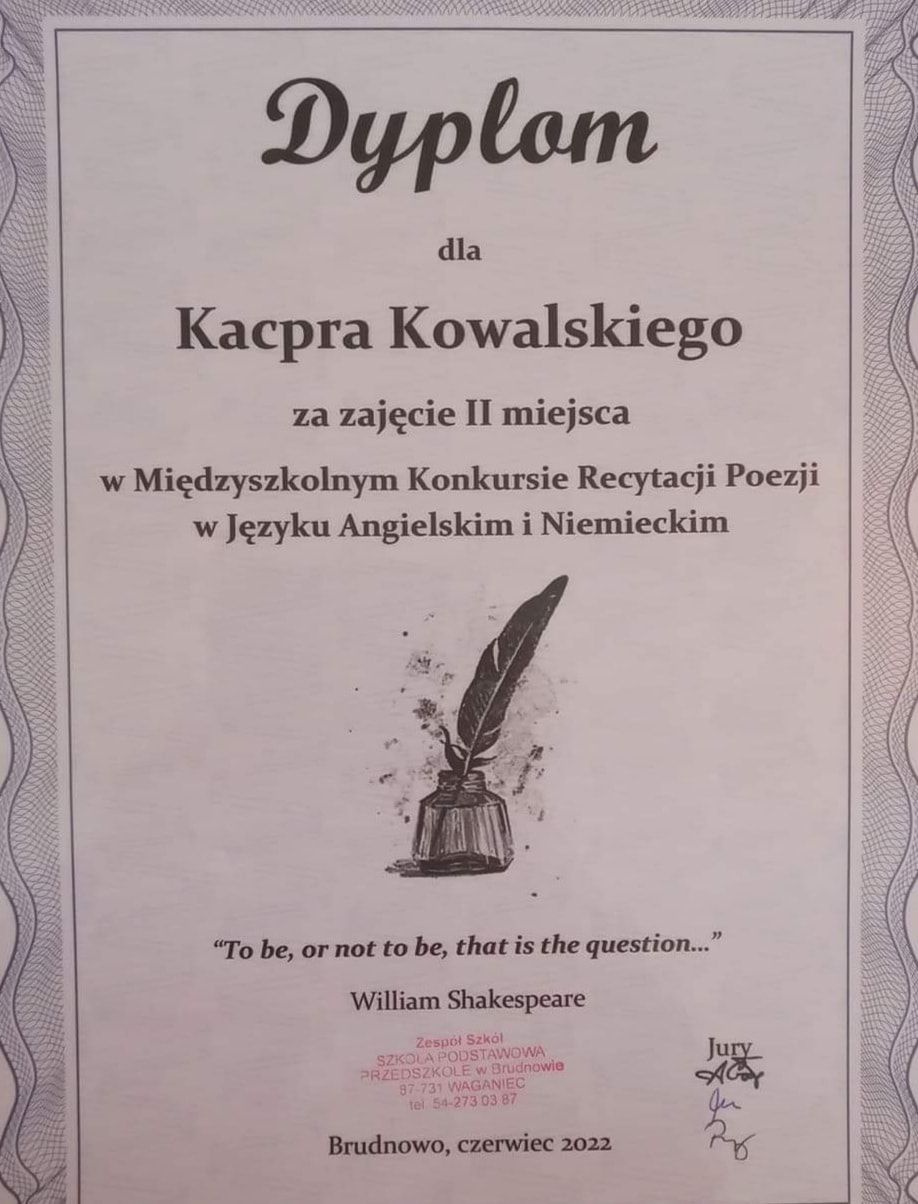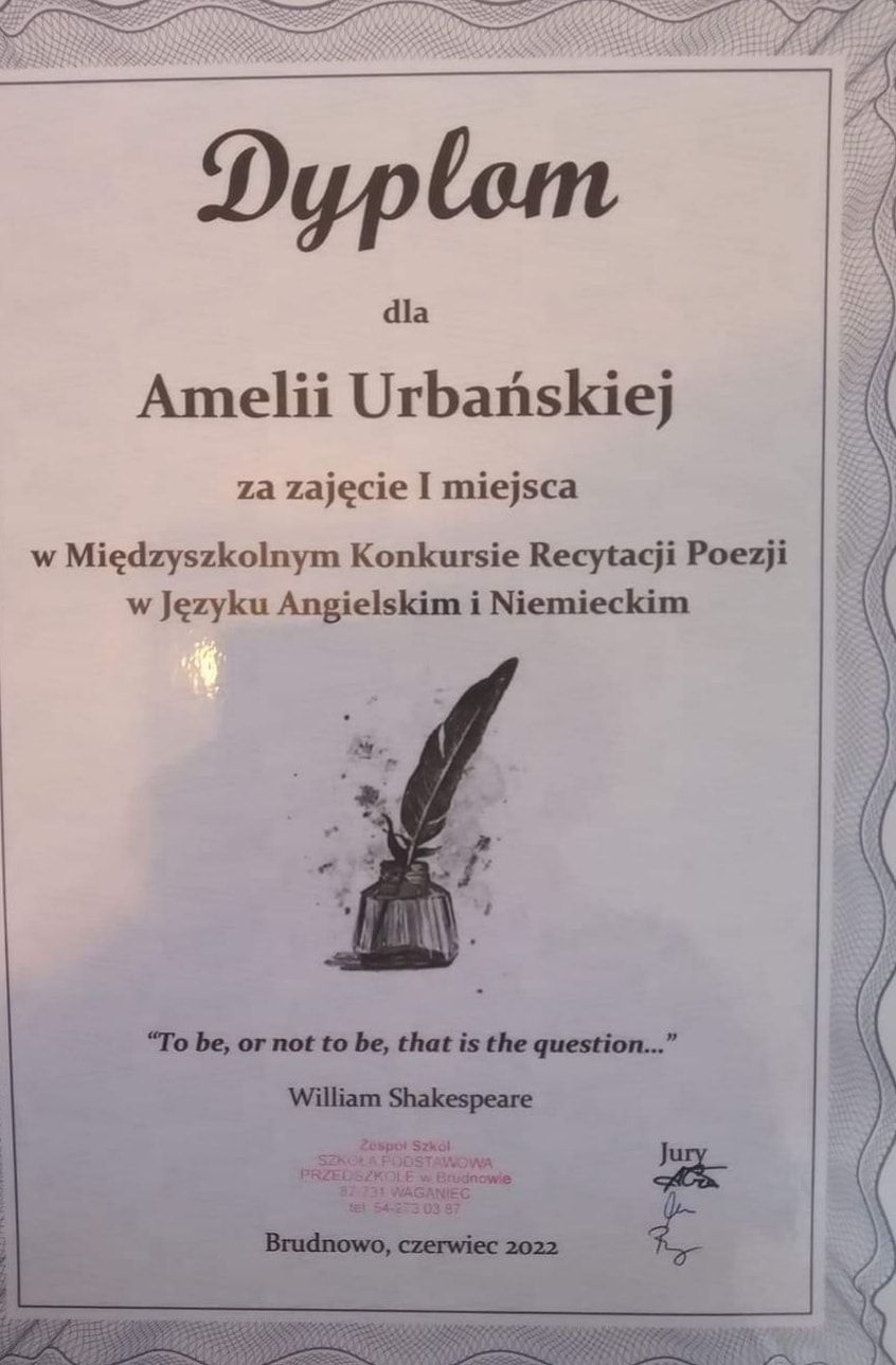 - Międzyszkolnym Konkursie Recytacji Poezji w języku angielskim i niemieckim- Amelka Urbańska I miejsce, a Kacper Kowalski II miejsce,