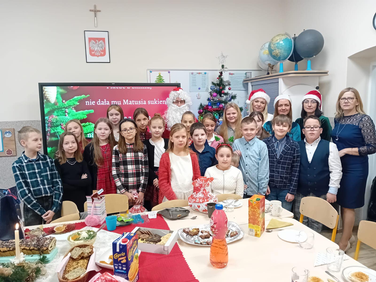 Cudownie udekorowane stoły , na nich świąteczne potrawy , sianko, opłatek, wyjątkowa atmosfera , wiele życzliwości , dobra , i czas wybaczania i jednania się… Wigilie w naszej szkole …